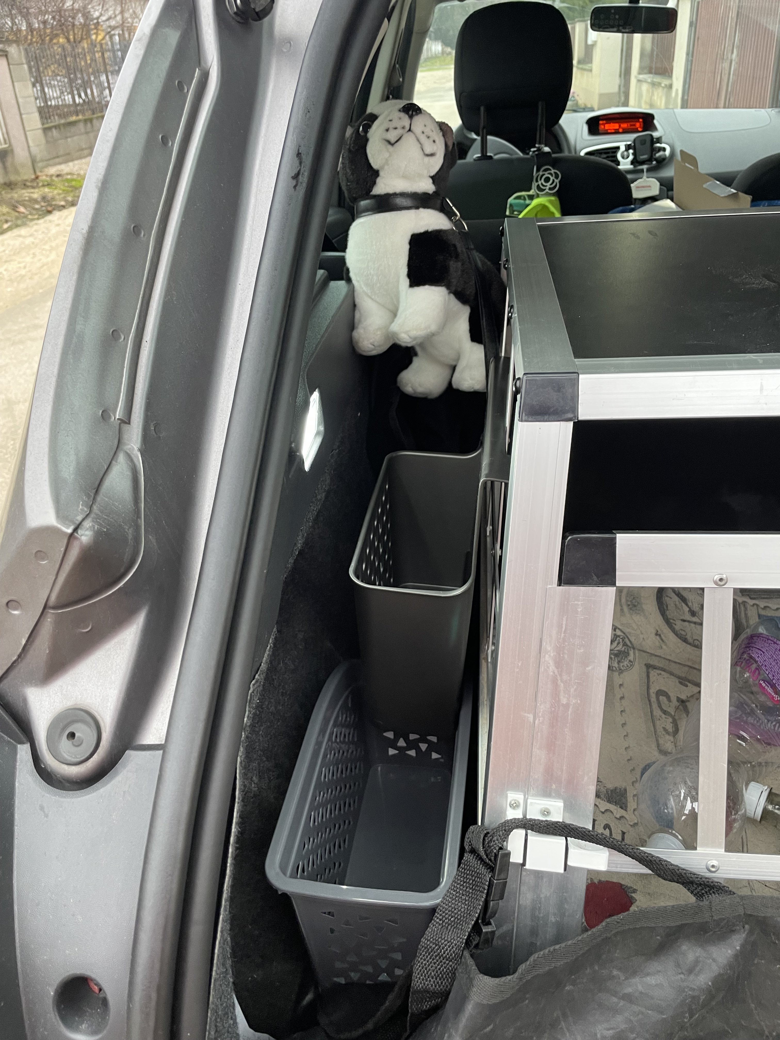 Az új autóm nem maradhat kutyásítás nélkül, így beszereztem pár apróságot. Persze a box hamar bekerült, de a felszerelésnek kellett megoldást találni. Az egyik kínai áruházban beszereztem műanyag tárolokat, amit megtöltöttem pórázzal, hámmal, kesztyűvel. Ezenkivül láthatósági mellény kutyának és nekem, törölköző…. és sok - sok minden.